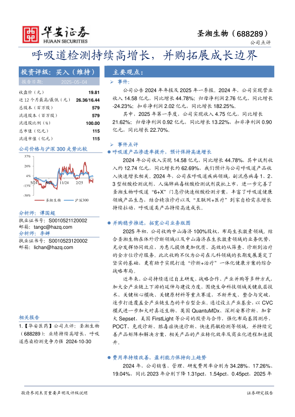 圣湘生物2024年报和2025年一季报显示,公司营收实现显著增长,尤其受益于呼吸道产品渗透率的提升。通过并购中山海济,公司进一步拓展了生长激素领域的业务,构建“诊断+治疗”一体化健康方案,并持续加大全产业链布局,打造平台型企业。