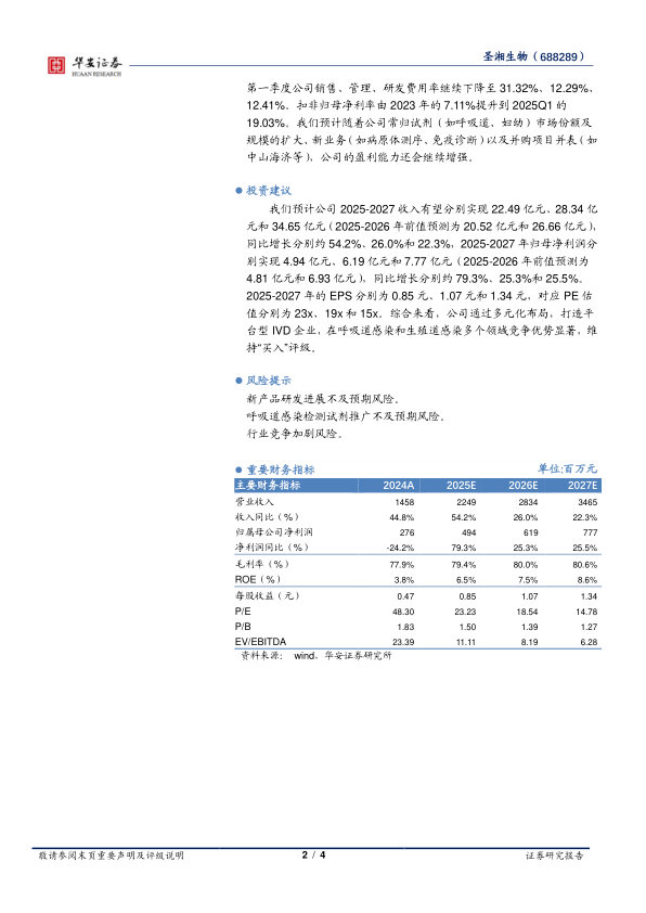 我们预计公司2025-2027收入有望分别实现22.49亿元、28.34亿元和34.65亿元(2025-2026年前值预测为20.52亿元和26.66亿元),同比增长分别约54.2%、26.0%和22.3%,2025-2027年归母净利润分别实现4.94亿元、6.19亿元和7.77亿元(2025-2026年前值预测为4.81亿元和6.93亿元),同比增长分别约79.3%、25.3%和25.5%。2025-2027年的EPS分别为0.85元、1.07元和1.34元,对应PE估值分别为23x、19x和15x。综合来看,公司通过多元化布局,打造平台型IVD企业,在呼吸道感染和生殖道感染多个领域竞争优势显著,维持“买入”评级。