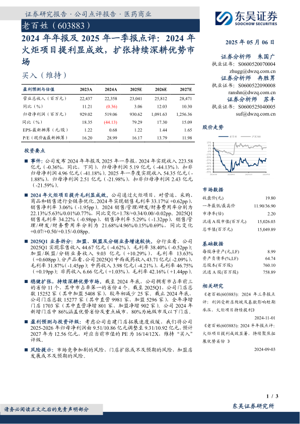 本报告对老百姓(603883)2024年年报及2025年一季报进行了深入分析,核心观点如下: