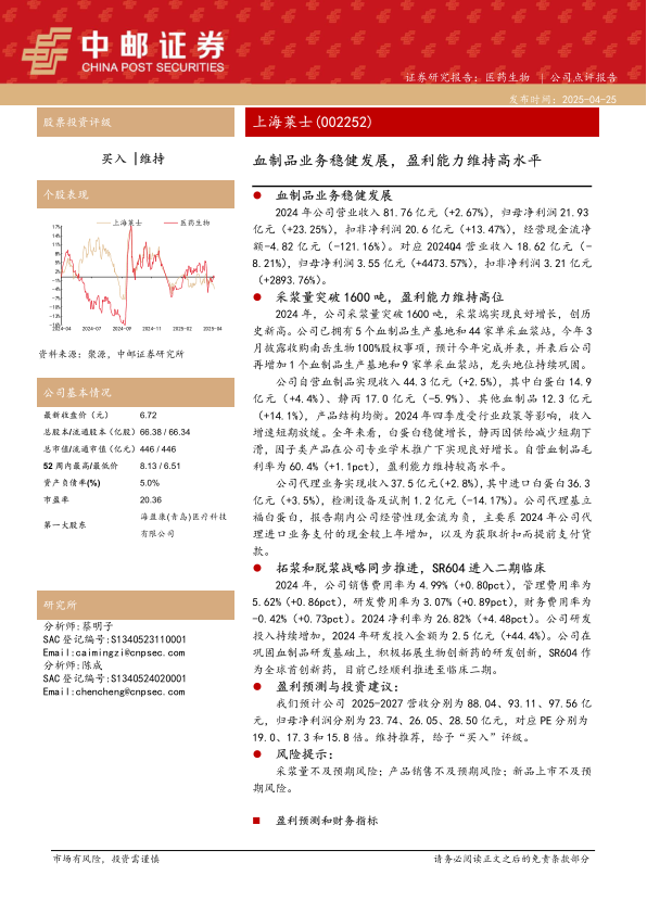 2024年,公司销售费用率为4.99%(+0.80pct),管理费用率为5.62%(+0.86pct),研发费用率为3.07%(+0.89pct),财务费用率为-0.42%(+0.73pct)。2024净利率为26.82%(+4.48pct)。公司研发投入持续增加,2024年研发投入金额为2.5亿元(+44.4%)。公司在巩固血制品研发基础上,积极拓展生物创新药的研发创新,SR604作为全球首创新药,目前已经顺利推进至临床二期。