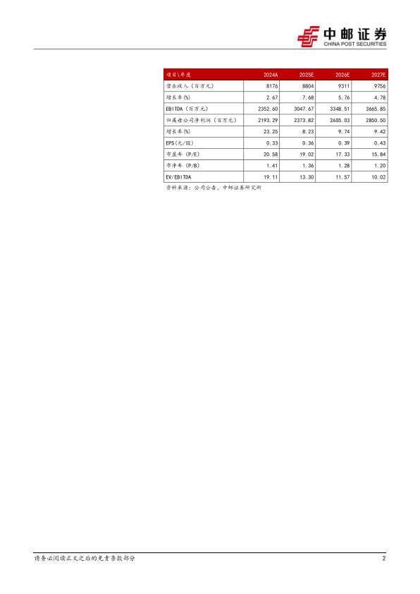 我们预计公司2025-2027营收分别为88.04、93.11、97.56亿元,归母净利润分别为23.74、26.05、28.50亿元,对应PE分别为19.0、17.3和15.8倍。维持推荐,给予“买入”评级。