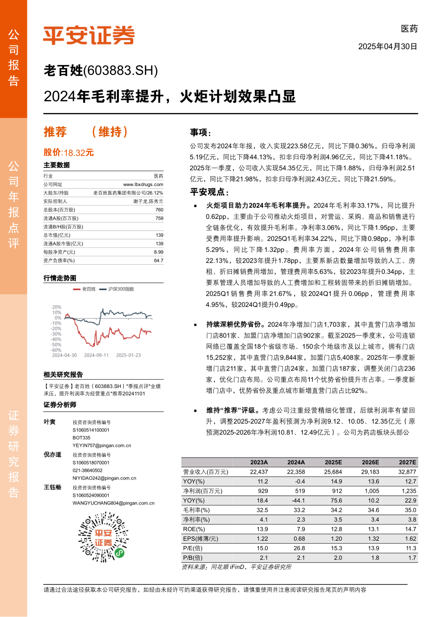 本报告分析了老百姓2024年年报和2025年一季度业绩,指出公司通过火炬项目提升毛利率,并持续深耕优势省份,优化门店布局。虽然短期业绩承压,但考虑到公司注重精细化管理,未来利润率有望回升,因此维持“推荐”评级,并调整了未来几年的盈利预测。报告同时提示了行业竞争加剧、经营不及预期以及药品安全等风险。