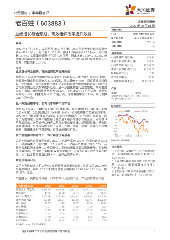 老百姓2022年上半年业绩增长稳健,得益于高效的组织改革和精益化运营管理。公司通过“自建、并购、加盟、联盟”四驾马车并驾齐驱,积极拓展下沉市场,并加强会员管理和专业药房建设。维持盈利预测和“买入”评级,但需关注疫情影响、门店扩张和市场竞争等风险。