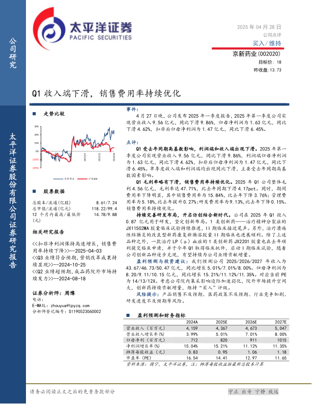 持续完善研发布局,开启仿创结合新时代。公司在2025年Q1投入0.87亿元用于研发,坚定创新布局。1类创新药——治疗精神分裂症的JX11502MA胶囊临床试验持续推进,II期临床接近尾声。另外,治疗溃疡性结肠炎的改良型新药康复新肠溶胶囊II期临床也进展顺利。除了上述品种之外,一款治疗LP(a)血症的1类创新药JX2201胶囊也在去年顺利提交临床申请,并于今年Q1取得临床批件,启动I期临床试验,随着公司创新品种逐步兑现,有望持续为公司业绩贡献增量。