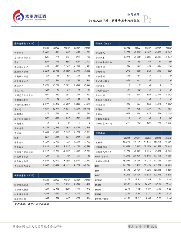 Q1收入端下滑,销售费用率持续优化
