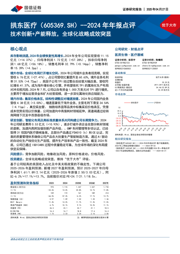 基于公司较高的美国收入占比以及中美关税政策的不确定性,国信证券对拱东医疗2025-2026年的盈利预测进行了下调,并新增了2027年的盈利预测。预计2025-2027年归母净利润分别为1.61亿元(同比-6.2%)、1.89亿元(同比+17.1%)和2.14亿元(同比+13.7%)。尽管盈利预测有所调整,但分析师仍维持了对拱东医疗“优于大市”的投资评级。这一评级反映了分析师对公司全球化战略成效、技术创新能力以及在市场结构调整中展现出的韧性的认可,认为公司具备超越市场平均水平的增长潜力,尤其是在其核心竞争力不断增强和海外市场持续拓展的背景下。当前股价对应的2025-2027年市盈率(PE)分别为24.7倍、21.1倍和18.5倍。