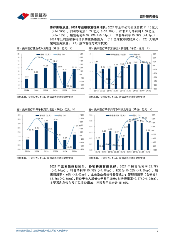 2024年,拱东医疗的财务表现呈现出强劲的恢复性增长态势。全年实现营业收入11.15亿元,较上年同期增长14.37%,显示出公司业务规模的稳步扩大。更值得关注的是,归属于母公司股东的净利润达到1.72亿元,同比大幅增长57.28%,扣除非经常性损益后的归母净利润也达到1.68亿元,同比增长56.18%,这表明公司的核心业务盈利能力显著增强。销售毛利率为32.79%,微增0.14个百分点,而销售净利率则提升了4.2个百分点至15.39%,反映出公司在营收增长的同时,盈利质量也得到了显著改善。公司业绩增长的主要驱动因素包括全球化布局的深化、大客户定制业务的放量以及有效的成本管控与效率优化。