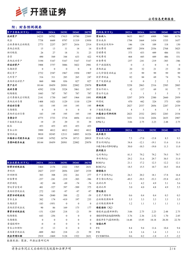 经营业绩阶段性承压,看好“研发+BD”打开成长空间,维持“买入”评级公司2024年实现营收80.17亿元(同比-16.96%,下文皆为同比口径);归母净利润25.32亿元(-10.32%);扣非归母净利润22.66亿元(-15.84%)。2025Q1实现营收15.25亿元(-36.51%);归母净利润4.40亿元(-47.91%);扣非归母净利润3.92亿元(-46.01%)。盈利能力方面,2024年毛利率为79.25%(-2.27pct),净利率为31.64%(+2.36pct)。费用方面,2024年销售费用率为36.85%(-4.65pct);管理费用率为5.40%(+1.54pct);研发费用率为5.55%(+0.74pct);财务费用率为-3.00%(-0.34pct)。考虑到公司经营业绩阶段性承压,下调2025-2026年并新增2027年盈利预测,预计2025-2027年归母净利润分别为20.52/22.83/25.34亿元(原预计为30.46/34.48亿元),EPS为2.23/2.48/2.75元,当前股价对应PE为11.6/10.4/9.4倍,我们看好公司研发布局带来的长期竞争力,维持“买入”评级。