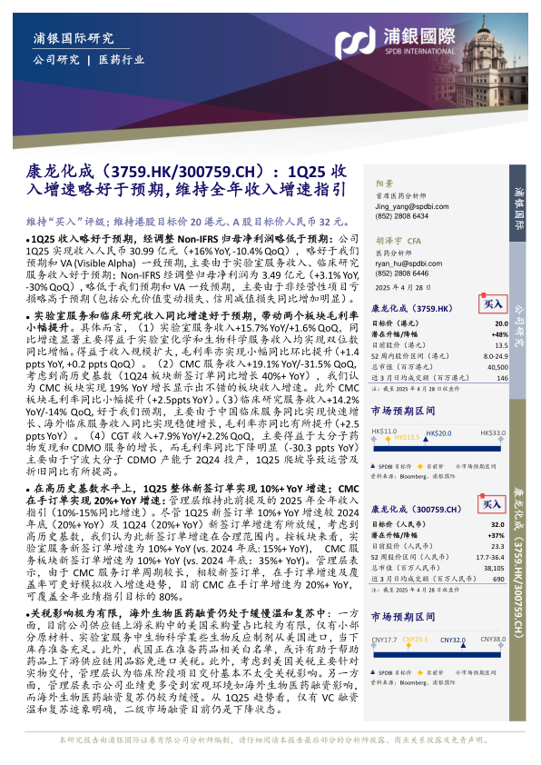 本报告分析了康龙化成(3759.HK/300759.CH)2025年第一季度的业绩表现,并维持了“买入”评级。