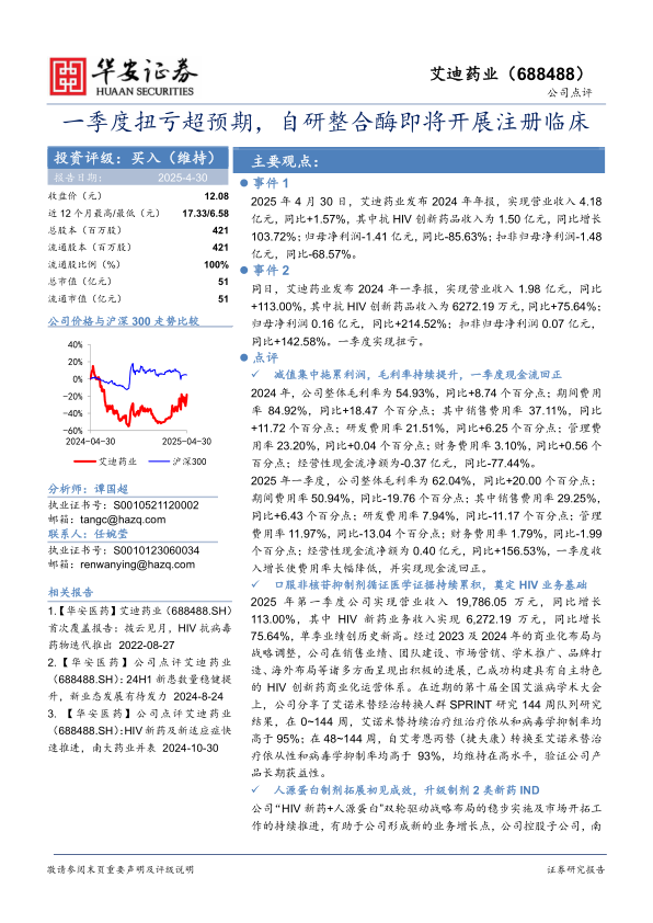 本报告全面分析了艾迪药业2024年业绩及2025年一季度超预期表现,详细阐述了公司在HIV药物领域的竞争优势、新药研发进展以及市场拓展情况。