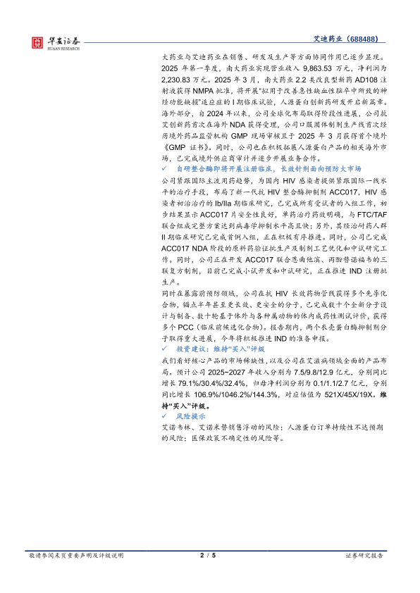 我们看好核心产品的市场稀缺性,以及公司在艾滋病领域全面的产品布局。预计公司2025~2027年收入分别为7.5/9.8/12.9亿元,分别同比增长79.1%/30.4%/32.4%,归母净利润分别为0.1/1.1/2.7亿元,分别同比增长106.9%/1046.2%/144.3%,对应估值为521X/45X/19X。维持“买入”评级。