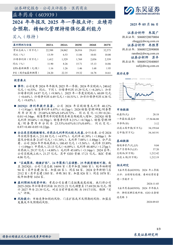 益丰药房2024年年报及2025年一季报显示,公司在复杂市场环境下依然保持了稳健的业绩增长,并通过精细化管理有效提升了盈利能力。