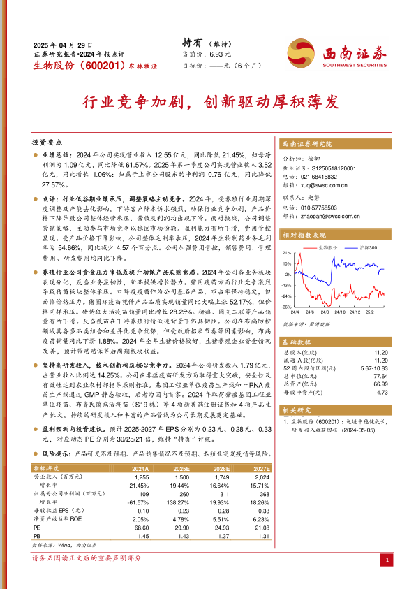 生物股份在2024年面临行业低谷和竞争加剧的双重压力下,业绩有所下滑。但公司通过调整策略、加强研发投入,积极应对挑战。报告预计公司未来几年EPS将稳步增长,维持“持有”评级,但同时也提示了相关风险。公司在反刍疫苗和新品研发方面的优势,以及对研发的持续投入,将为未来的发展提供动力。