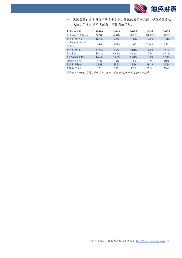 风险因素:零售药房市场竞争加剧、医保政策变动风险、税收政策变动风险、门店扩张不及预期、商誉减值风险。