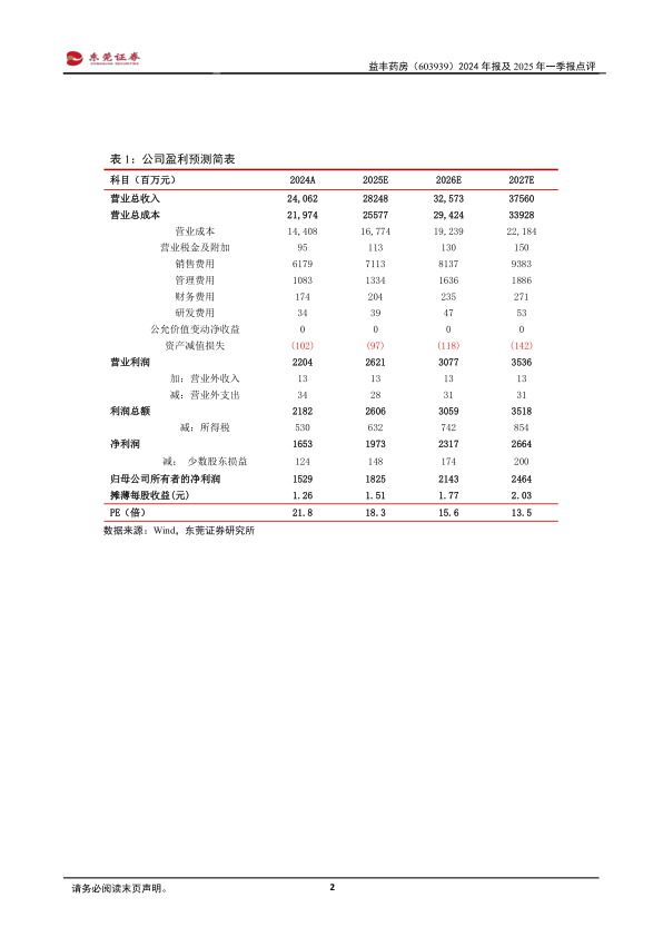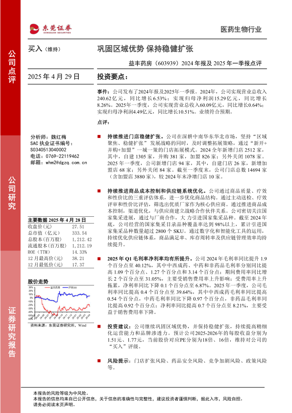益丰药房2024年报及2025年一季报显示,公司在巩固区域优势的基础上,持续推进门店稳健扩张,并通过优化商品结构和供应链体系,有效控制成本,提升盈利能力。