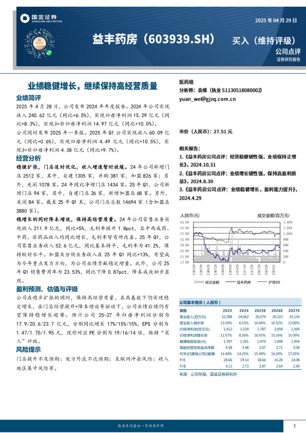 公司在稳步扩张的同时,保持高经营质量,在高基数下仍实现稳定增长,在门店经营提升+降本增效等驱动下,公司业绩后续仍有望保持稳增长趋势。预计公司25-27年归母净利润分别为17.9/20.6/23.7亿元,分别同比增长17%/15%/15%,EPS分别为1.47/1.70/1.95元,现价对应PE分别为19/16/14倍,维持“买入”评级。