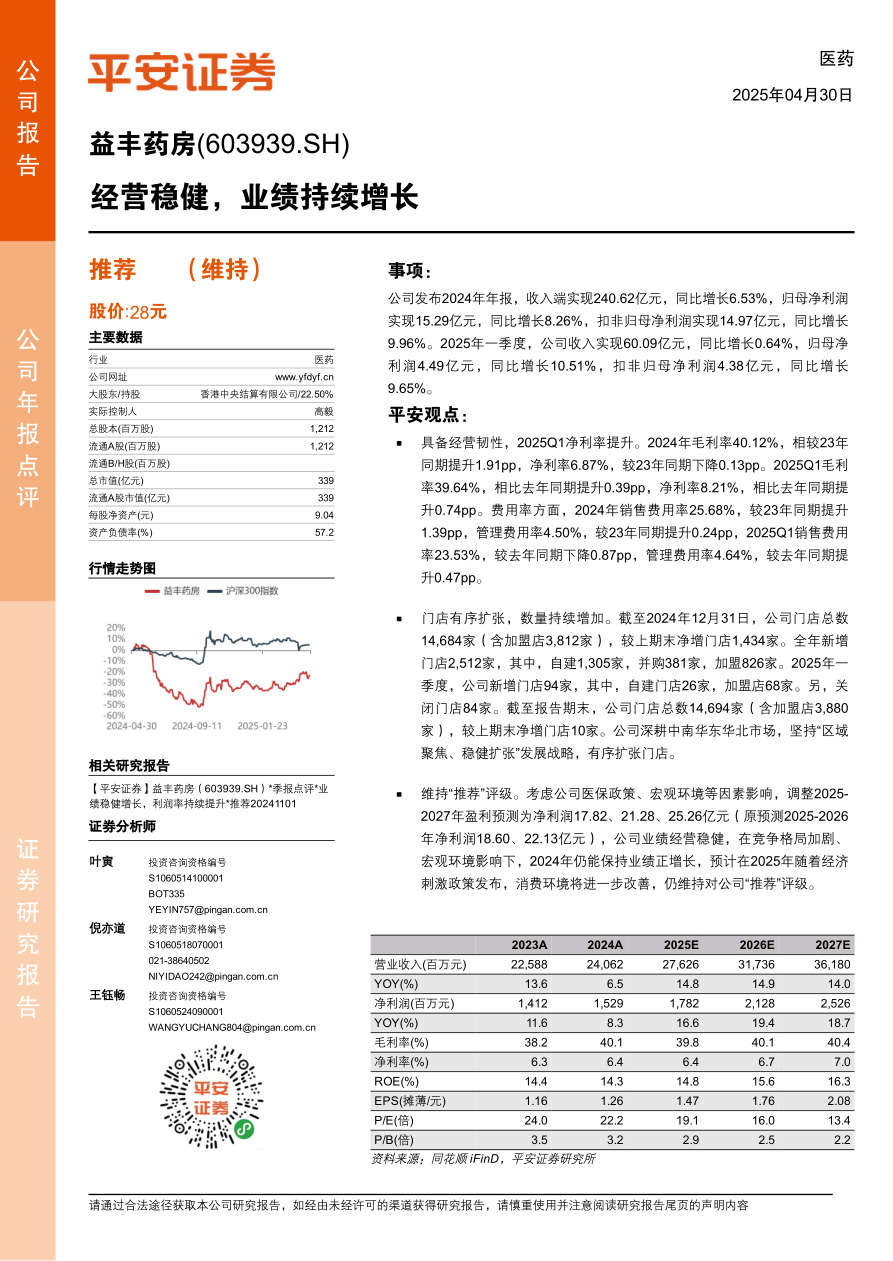 益丰药房在2024年及2025年一季度表现出稳健的经营态势,通过有效的成本控制和门店扩张策略,实现了盈利能力的提升。尽管面临外部环境的挑战,公司仍保持了增长势头。平安证券维持对益丰药房的“推荐”评级,并对其未来发展持乐观态度,预计在经济刺激政策的推动下,公司业绩将进一步提升。
