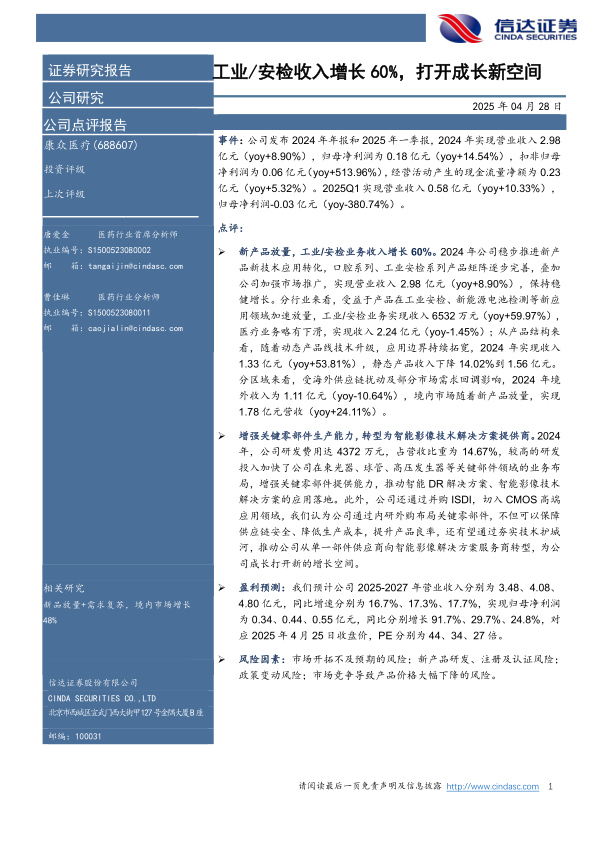 本报告分析了公司2024年年报和2025年一季报,指出公司受益于新产品放量,工业/安检业务收入大幅增长,成为新的增长点。同时,公司通过加大研发投入和并购等方式,增强关键零部件生产能力,并积极布局CMOS高端应用领域,旨在从单一部件供应商向智能影像技术解决方案提供商转型。报告预计公司未来几年营收和利润将保持较快增长,但也提示了市场开拓、新产品研发、政策变动和市场竞争等风险。