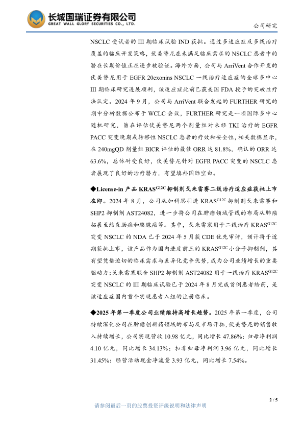 2025年第一季度公司业绩维持高增长趋势。2025年第一季度,公司持续深化公司在肿瘤创新药领域的布局及市场开拓,伏美替尼的销售收入持续增长,公司实现营收10.98亿元,同比增长47.86%;归母净利润4.10亿元,同比增长34.13%;扣非归母净利润3.96亿元,同比增长31.45%;经营活动现金净流量3.93亿元,同比增长7.54%。