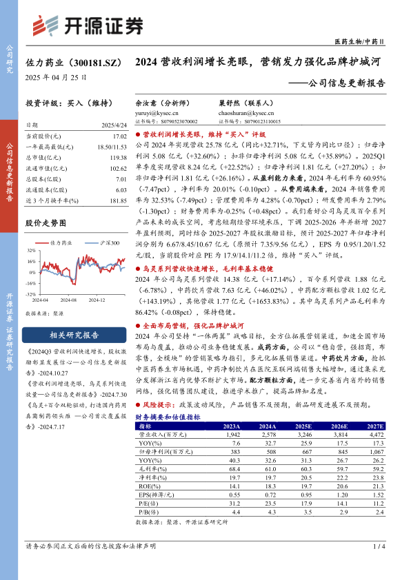 单季度实现营收8.24亿元(+22.52%);归母净利润1.81亿元(+27.20%);扣非归母净利润1.81亿元(+26.16%)。从盈利能力来看,2024年毛利率为60.95%(-7.47pct),净利率为20.01%(-0.10pct)。从费用端来看,2024年销售费用率为32.53%(-7.49pct);管理费用率为4.28%(-0.70pct);研发费用率为2.79%(-1.30pct);财务费用率为-0.25%(+0.48pct)。我们看好公司乌灵及百令系列产品未来的成长空间,考虑短期经营环境承压,下调2025-2026年并新增2027年盈利预测,同时结合2025-2027年股权激励目标,预计2025-2027年归母净利润分别为6.67/8.45/10.67亿元(原预计7.35/9.56亿元),EPS为0.95/1.20/1.52元/股,当前股价对应PE为17.9/14.1/11.2倍,维持“买入”评级。