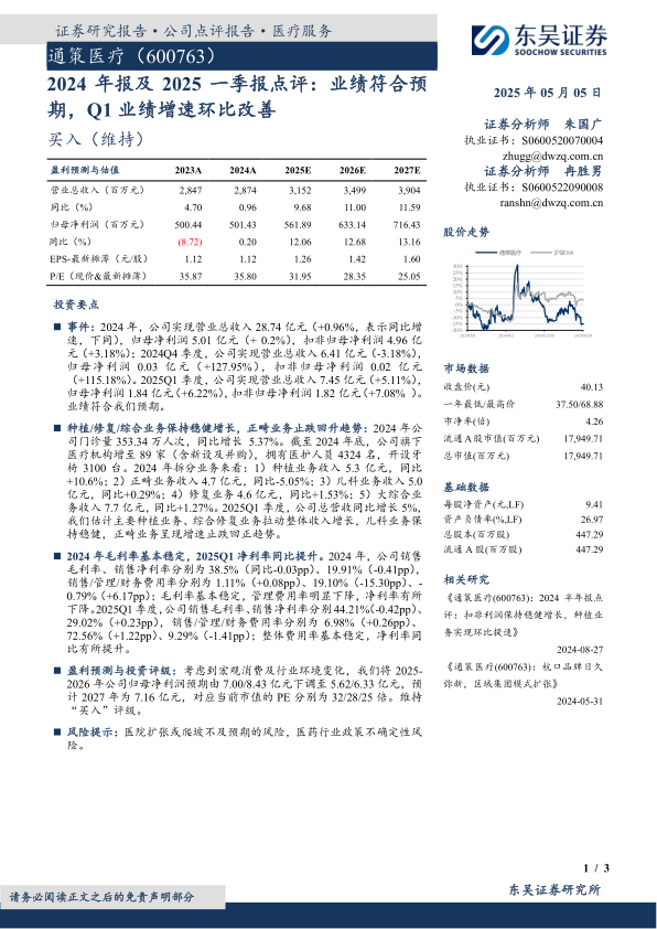 通策医疗在2024年实现了营收和归母净利润的稳健增长,并在2025年第一季度展现出业绩增速的环比改善。公司通过持续的医疗机构扩张和医护人员增加,有效提升了门诊量。核心业务中,种植、修复和综合业务保持了良好增长,正畸业务也呈现止跌回升的积极态势。财务方面,2024年毛利率基本稳定,2025年Q1净利率同比提升,显示出公司良好的盈利能力。尽管宏观环境变化导致盈利预测有所下调,但公司仍维持“买入”评级,并提示了医院扩张和政策不确定性等风险。