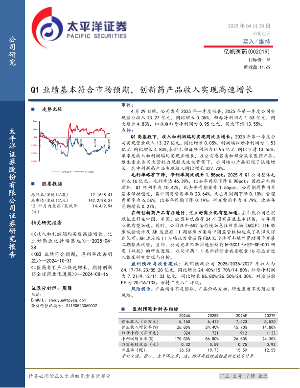 亿帆医药2025年第一季度业绩基本符合市场预期,在较高基数下实现了收入和归母净利润的同比正增长。公司核心亮点在于创新药产品收入实现了高达327.73%的同比高速增长,显示出其在研管线商业化和研发进展的积极态势。