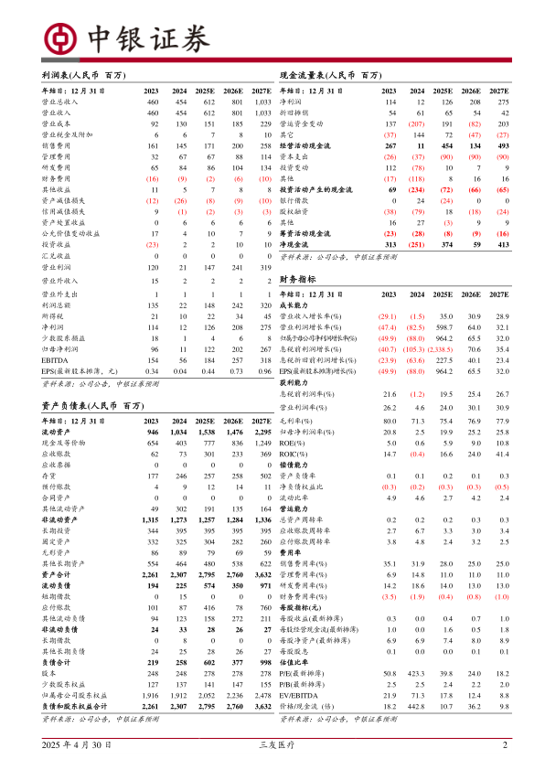 鉴于集采对公司终端产品价格的较大影响,分析师对三友医疗2025-2027年的归母净利润预测进行了调整,分别为1.22亿元、2.02亿元和2.66亿元(原2025-2026年预测为2.01亿元和2.73亿元)。对应每股收益(EPS)分别为0.44元、0.73元和0.96元。截至4月29日收盘价,对应市盈率(PE)分别为39.8倍、24.0倍和18.2倍。尽管2024年受集采影响较大,但考虑到公司在新业务布局(超声骨刀和国际化)方面的快速进展,分析师维持了“买入”评级,看好公司未来的增长潜力。