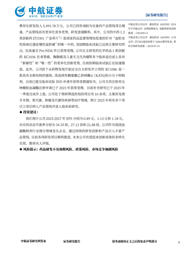 2024年,公司维持较高的创新研发投入,全年累计研发投入达1.39亿元,占公司营业收入比例16.83%,其中资本化研发投入8,395.42万元,费用化研发投入5,493.78万元。公司已经形成较为完备的产品管线项目储备,产品管线具有差异化竞争优势,研发进展顺利。其中,公司的中药1.2类创新药ZY5301(“金草片”)是国家药品监督管理局批准的针对“盆腔炎性疾病后遗症慢性盆腔痛”的唯一中药,其Ⅲ期临床试验已达到主要研究终点,完成递交Pre-NDA并已获得受理。公司自主研发的化学药品1类创新药KC1036在食管癌、胸腺癌及儿童尤文氏肉瘤等多个临床适应症上具有“新颖性”和“唯一性”的差异化创新优势,目前Ⅲ期临床试验正在加速推进。此外,公司首个从药物发现开始完全自主研发并立项的KC1086是一款具有全新结构的强效、高选择性赖氨酸乙转移酶6(KAT6)的小分子抑制剂,目前已提交临床试验IND申请并获得受理通知书。公司犬用注射用尖吻蝮蛇血凝酶注册申请已于2023年获得受理,目前补充研究已于2025年一季度完成并上报。公司处于预研筛选阶段的项目有10余项,主要涉及围手术期、骨代谢、肿瘤及代谢性疾病等治疗领域,预计2025年将有多个项目立项后纳入产品管线并进入临床前研究。