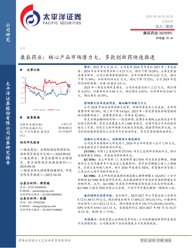 公司持续加大研发投入,多个创新药项目(包括ZY5301、KC1036和KC1086)进展顺利。其中,ZY5301即将递交NDA,KC1036的食管鳞癌适应症已进入三期临床,KC1086已提交IND。这些创新药有望填补市场空白,成为公司未来业绩增长的新引擎,支撑公司长期发展。