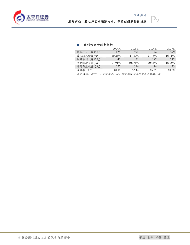 太平洋证券预计康辰药业2025-2027年营业收入将分别达到9.72亿元、11.84亿元和13.79亿元,同比增速分别为17.80%、21.76%和16.51%。归母净利润预计分别为1.51亿元、1.82亿元和2.12亿元,同比增速分别为256.71%、20.64%和16.85%。摊薄每股收益(EPS)预计分别为0.94元、1.14元和1.33元。当前股价对应2025-2027年PE分别为32倍、27倍和23倍。
