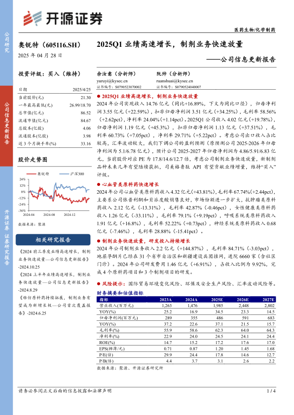 奥锐特在2024年及2025年第一季度展现出强劲的业绩增长,特别是归母净利润和扣非归母净利润增速显著,凸显了公司盈利能力的持续提升。制剂业务的爆发式增长是公司业绩的核心驱动力,地屈孕酮片等产品市场拓展成效显著,为公司贡献了重要的增量收入。在原料药业务方面,心血管类原料药表现突出,通过依普利酮和贝派度酸等产品的良好销售扩大了市场份额。公司持续加大研发投入,积极布局新制剂品种和高价值API,如司美格鲁肽API,为未来的可持续发展奠定了坚实基础。尽管面临国际贸易环境变化、环保安全生产以及汇率波动等风险,但公司凭借其优化的产品结构、强大的市场拓展能力和持续的创新投入,预计将保持稳健的增长态势。基于对公司未来业绩增长潜力的分析和当前估值水平,分析师维持了“买入”的投资评级。