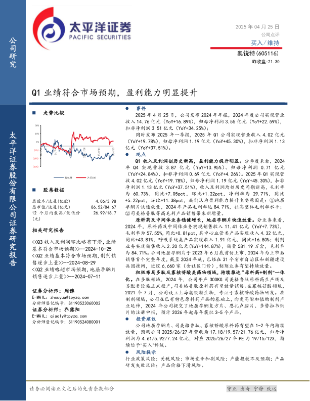 奥锐特Q1业绩符合预期,盈利能力显著提升,主要受益于地屈孕酮片放量和高毛利产品销售。公司在原料药和制剂业务上均表现出稳健增长,并积极布局多肽和寡核苷酸药物领域,推进“原料药+制剂”一体化战略。