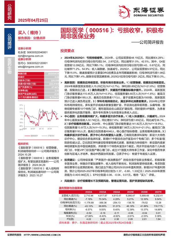 本报告的核心观点是,国际医学在2024年及2025年第一季度持续实现亏损收窄,营收保持稳健增长。公司通过优化业务结构,积极布局非医保业务,提升医疗服务能力,有望在未来实现盈利。