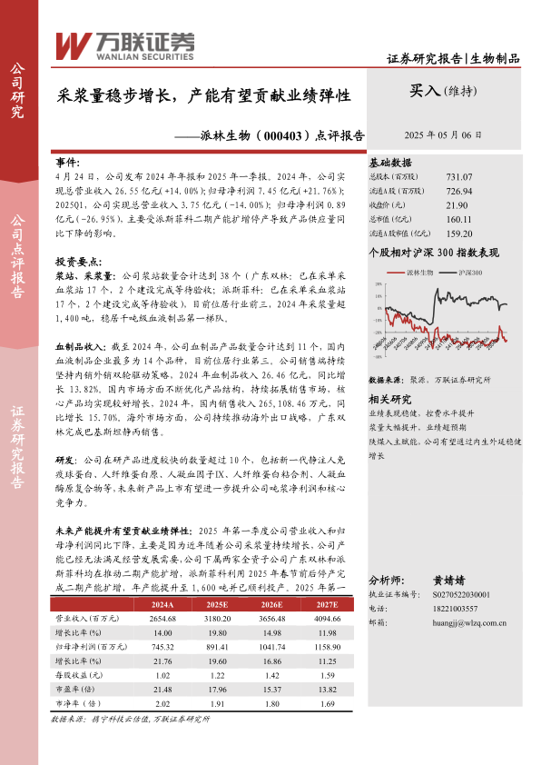 尽管公司在2025年第一季度因派斯菲科二期产能扩增停产导致产品供应量下降,从而出现营收和归母净利润的短期下滑,但这是为实现长期产能提升所做的战略性调整。报告维持“买入”评级,强调血液制品行业的高景气度以及公司在产品研发、市场拓展方面的持续努力,预示着公司在克服短期挑战后,有望实现稳健的业绩增长和核心竞争力的进一步提升。