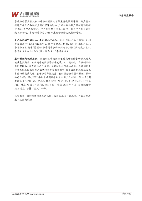 盈利预测与投资建议:血液制品作为国家重要战略性储备物资及重大疾病急救药品,未来随着我国经济水平发展、人口老龄化、血液制品临床刚需增加、消费结构趋于合理、血浆综合利用能力提升、血液制品出口常态化及国家加大产业扶持力度等因素影响,我国血液制品行业未来有望持续高景气度。基于公司年报披露,我们调整公司盈利预测,预计公司2025/2026/2027年归母净利润分别为8.91/10.42/11.59亿元(调整前为9.34/10.66/-亿元),对应EPS1.22元/股、1.42元/股、1.59元/股,对应PE为17.96/15.37/13.82(对应2025年4月30日收盘价21.9元),维持“买入”评级。