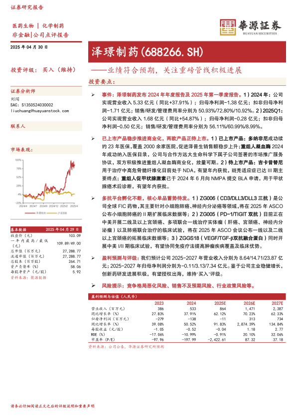 本报告分析了泽璟制药(688266.SH)2024年年度报告及2025年第一季度报告,指出公司业绩符合预期,已上市产品商业化稳步推进,多款创新药研发进展积极,有望授权出海。