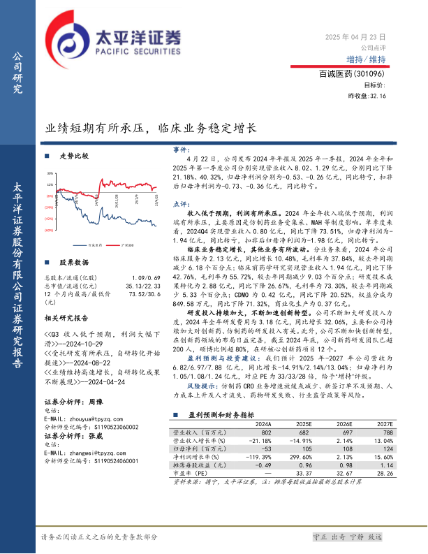 百诚医药在2024年及2025年第一季度面临严峻的业绩挑战,营收和利润均出现显著下滑并转亏,这主要归因于仿制药业务受集采等政策影响。然而,公司内部业务结构呈现亮点,临床服务业务保持稳定增长,且公司正积极通过加大研发投入、加速创新药布局来应对行业变化,新药研发团队和项目储备均有显著提升。尽管短期业绩承压,但分析师基于对公司创新转型潜力和临床业务稳定性的判断,维持“增持”评级,并预计公司未来几年业绩将逐步恢复增长。投资者需关注仿制药CRO业务增速、新签订单、人才流失以及研发失败等潜在风险。