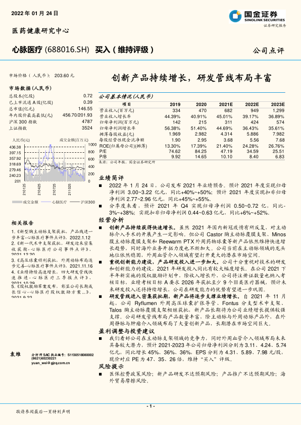 心脉医疗凭借创新产品的持续增长和研发投入的不断加大,巩固了在主动脉支架领域的领先地位,并积极拓展外周血管介入领域。公司研发管线进入密集获批期,新产品将为未来业绩增长提供强劲动力。维持“买入”评级,但需关注医保控费、研发风险、推广风险和海外贸易摩擦等风险因素。