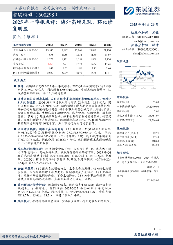 安琪酵母2025年一季报显示,公司营收和归母净利润均实现增长,海外市场表现强劲,但国内市场受事业部调整影响略有承压。报告维持了对公司未来盈利的预测,并维持“买入”评级。
