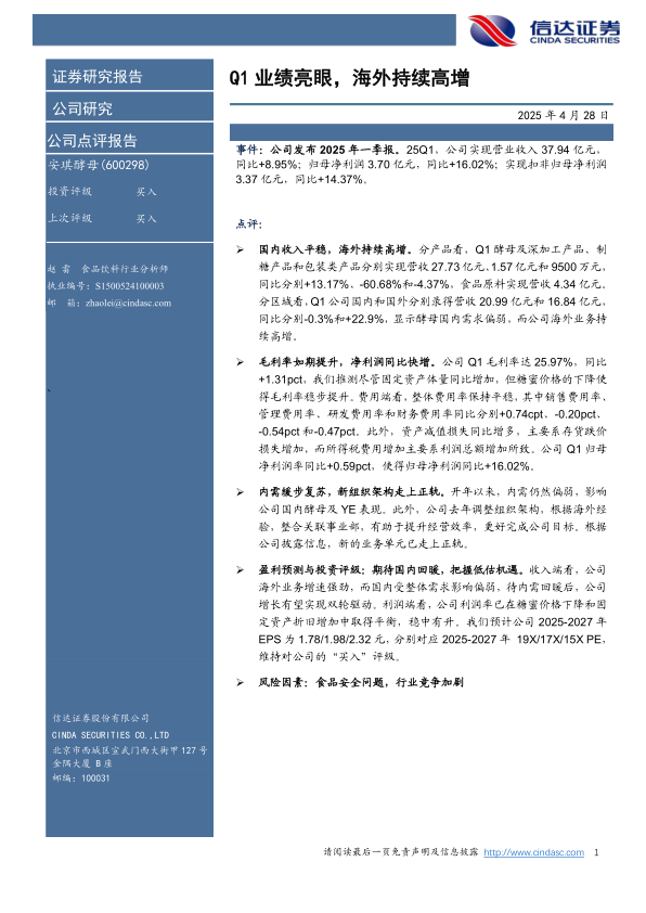 本报告对安琪酵母2025年一季报进行了全面分析,指出公司海外业务持续高增,利润率稳中有升,维持“买入”评级。尽管国内需求偏弱,但公司通过组织架构调整和海外市场拓展,有望实现持续增长。投资者应关注食品安全和行业竞争等风险因素。
