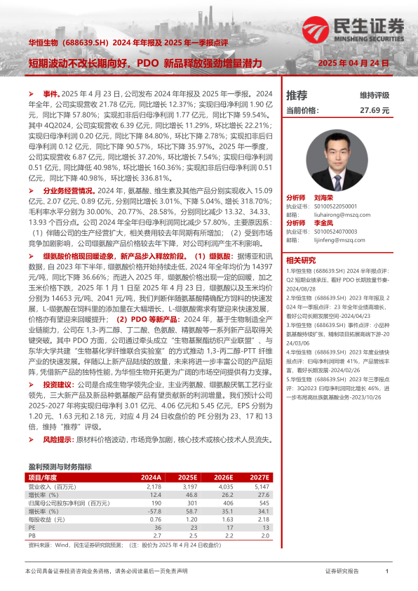 投资建议:公司是合成生物学领先企业,主业丙氨酸、缬氨酸厌氧工艺行业领先,三大新产品及新品种氨基酸产品有望贡献新的利润增量。我们预计公司2025-2027年将实现归母净利3.01亿元、4.06亿元和5.45亿元,EPS分别为1.20元、1.63元和2.18元,对应4月24日收盘价的PE分别为23、17和13倍,维持“推荐”评级。