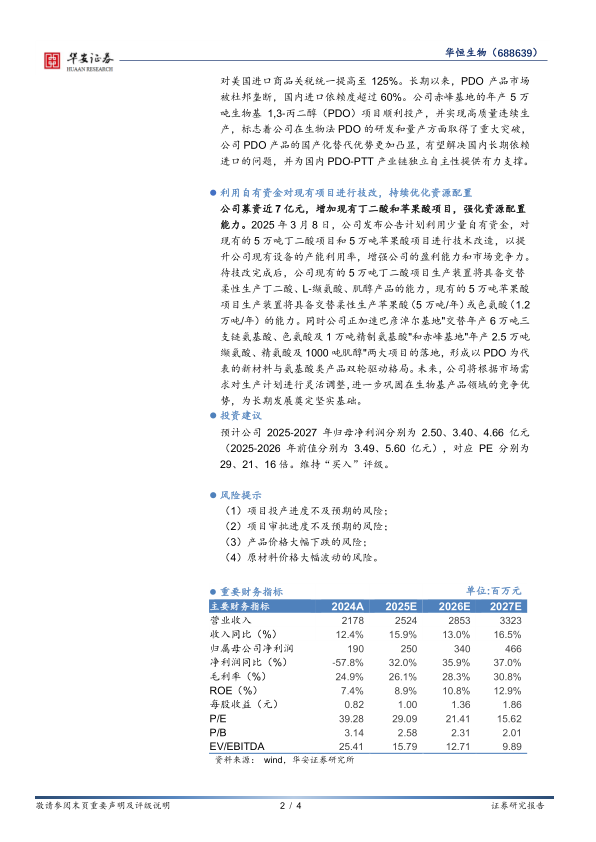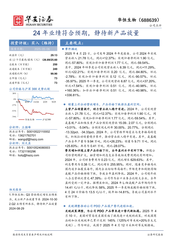本报告分析了华恒生物2024年业绩,指出公司营收增长但盈利受产品价格下跌影响。关税政策调整为公司PDO产品带来进口替代机遇,公司通过技术改造和产能扩张,有望受益于新产品放量和国产替代加速。维持“买入”评级,但需关注项目投产进度、审批进度、产品价格和原材料价格波动等风险。