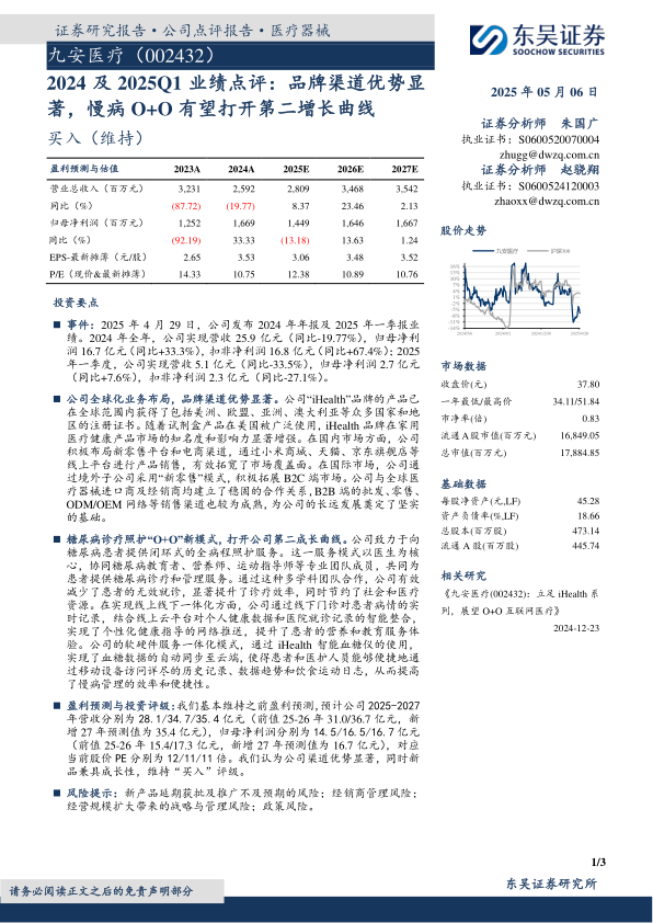 本报告对九安医疗2024年及2025年一季度的业绩进行了分析,指出公司在全球化业务布局和品牌渠道方面的显著优势。同时,强调了公司在糖尿病诊疗照护“O+O”新模式上的创新,认为该模式有望打开公司第二增长曲线。