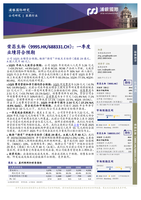本报告对荣昌生物(9995.HK/688331.CH)2025年一季度业绩进行了分析,认为其收入、费用管控和净亏损均符合预期。