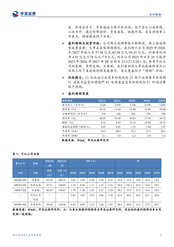 盈利预测及投资评级:公司两大品牌势能不断释放,线上渠道转型成果显著,大单品策略持续强化。我们预计公司2025年/2026年/2027年收入为37.36亿元/45.58亿元/59.25亿元,归母净利润为4.91亿元/5.78亿元/7.9亿元。对应公司2025年4月28日股价2025年/2026年/2027年PE分别为32.3/27.5/20.1倍。参考可比公司珀莱雅、华熙生物、贝泰妮,我们看好其大单品策略的深化以及线上线下渠道的协同发展潜力,首次覆盖给予“增持”评级。