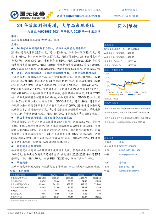 国元证券维持丸美生物“买入”评级,但同时也提示了品牌市场竞争加剧、行业景气度下降以及新品牌表现不达预期等风险因素。