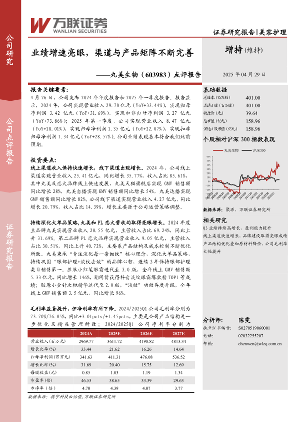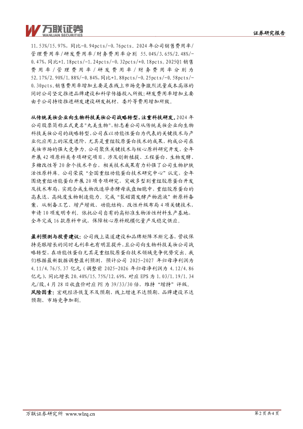 盈利预测与投资建议:公司线上渠道建设和品牌矩阵不断完善,营收保持亮眼增长的同时毛利率也有明显提升,且公司向生物科技美妆公司战略转型,在功能性蛋白尤其是重组胶原蛋白技术领域竞争优势突出。我们根据最新数据调整盈利预测,预计公司2025-2027年归母净利润为4.11/4.76/5.37亿元(调整前2025-2026年归母净利润为4.12/4.86亿元),同比增长20.40%/15.75%/12.69%,对应EPS为1.03/1.19/1.34元/股,4月28日收盘价对应PE为39/33/30倍,维持“增持”评级。