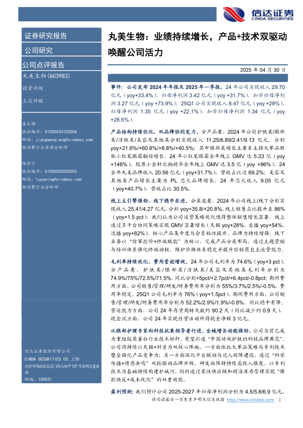 丸美生物在2024年及2025年一季度均实现了显著的业绩增长,这主要归功于其持续优化的产品结构、双品牌战略的有效协同以及线上线下渠道的均衡发展。