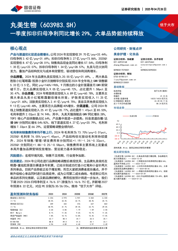 丸美生物在2024年及2025年第一季度表现出色,营收和利润均实现高速增长,特别是扣非归母净利润增幅亮眼。公司成功实施品牌战略调整,主品牌丸美凭借在眼霜和重组胶原蛋白赛道的深厚积累,成功打造了“小红笔”和“小金针”两大系列大单品,目前产品势能正处于爆发期。同时,恋火品牌精准抓住消费者底妆痛点,通过核心单品升级和品类延伸,已成为公司重要的第二增长曲线。尽管考虑到大单品系列化推新和新品牌孵化将加大费用投放,分析师下调了2025-2026年归母净利预测,但新增了2027年预测,并维持“优于大市”的投资评级,表明对公司未来持续增长的信心。公司通过产品结构优化、渠道精细化运营以及有效的成本管控,持续提升盈利能力和市场竞争力。
