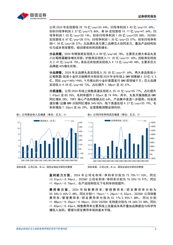 产品与渠道优化促进业绩增长。公司2024年实现营收29.70亿/yoy+33.44%;归母净利3.42亿/yoy+31.69%;扣非归母净利3.27亿/yoy+73.86%。2025Q1实现营收8.47亿/yoy+28.01%;销售商品现金流同比增长57.54%;归母净利1.35亿/yoy+22.07%;扣非归母净利1.34亿/yoy+28.57%;丸美与恋火协同发力,叠加产品结构优化与成本有效管控,驱动营收和利润高增长。